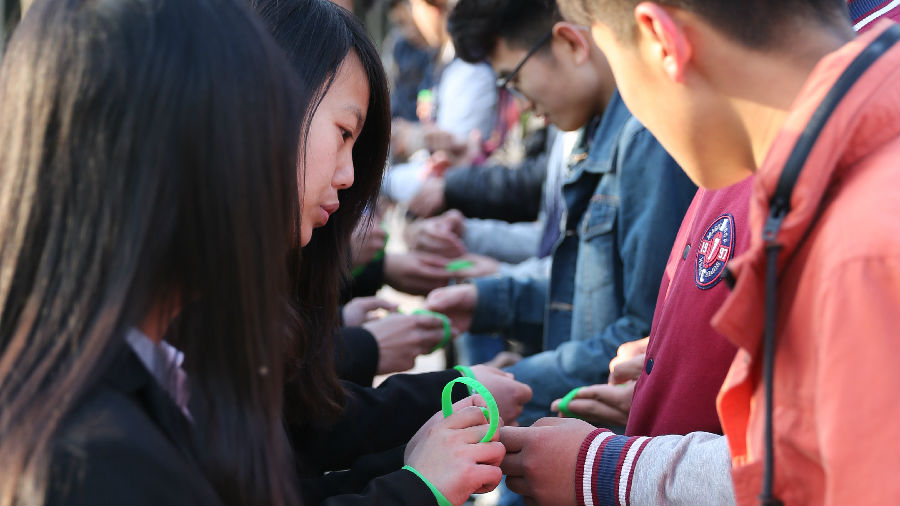 为学生代表佩戴象征文明的生科院五周年院庆承诺手环。
