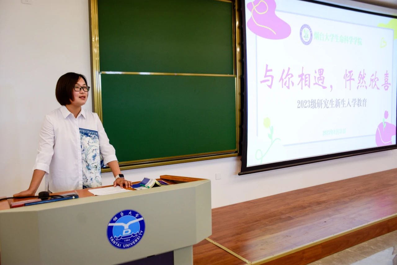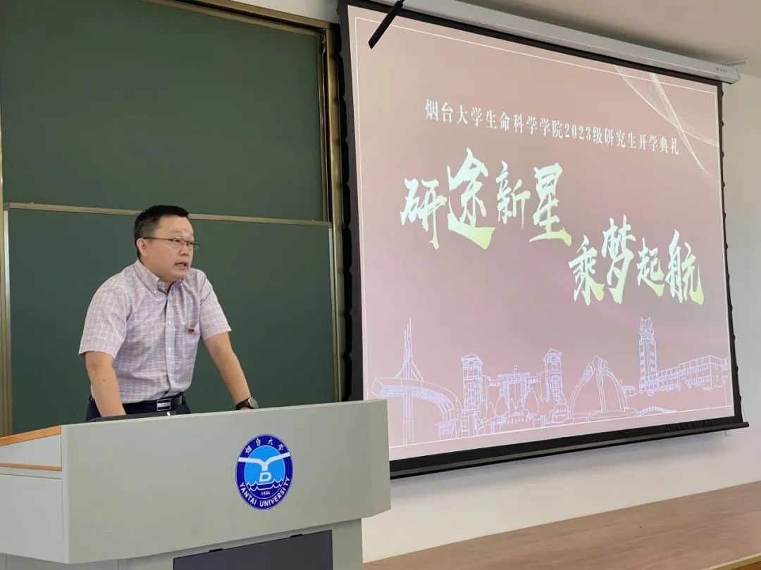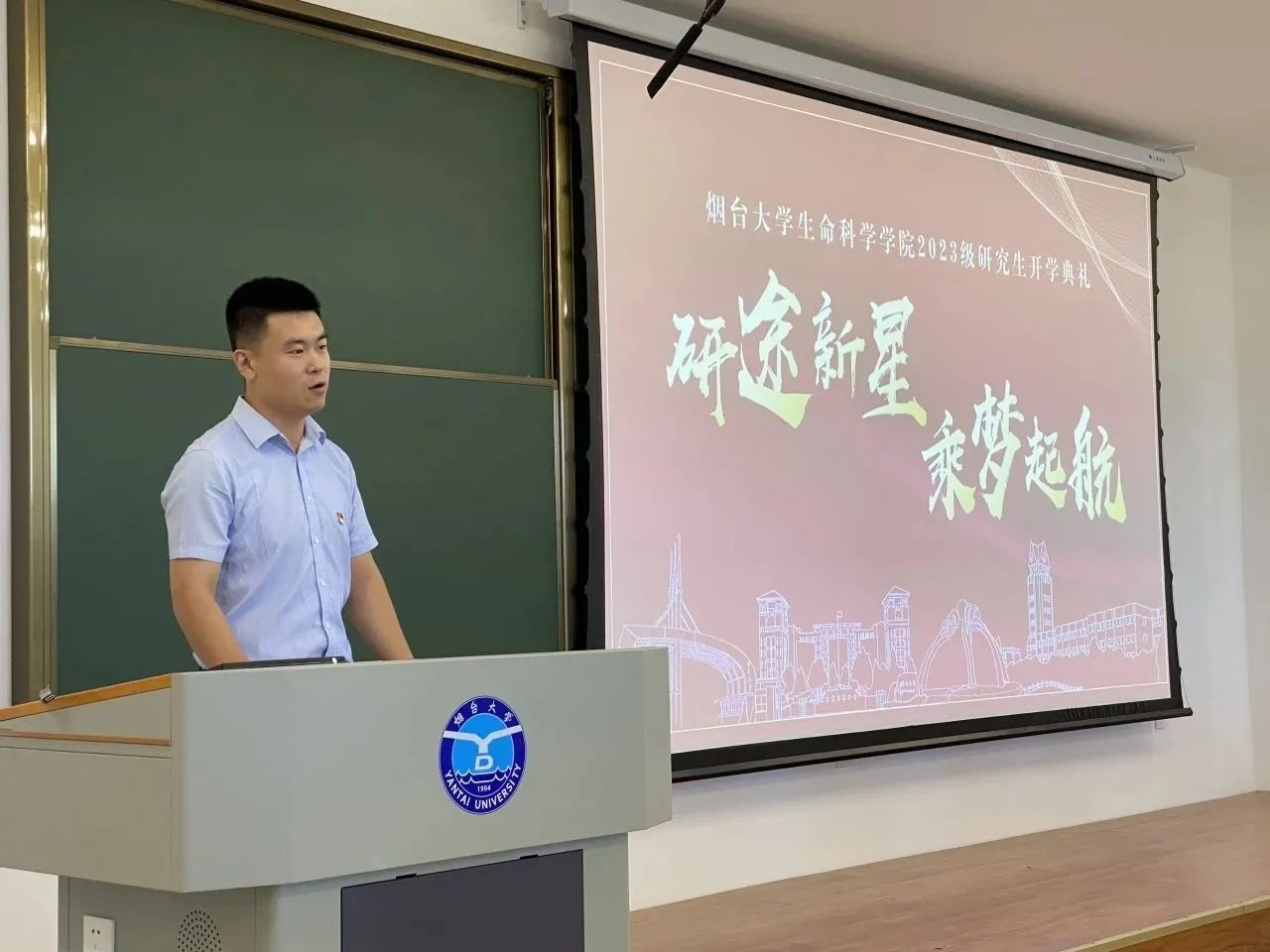 全体师生热烈欢迎126名硕士研究生的到来,他围绕研究生阶段的发展与成长,对即将踏入学术新征途的新生们提出三点要求:一练就过硬本领,二全面综合发展,三勇担时代责任。学院院长孙利芹分别就学院的发展历程、学位点与研究生培养、师资队伍与科研实力等方面向同学们做了详细的介绍,鼓励同学们树立科研信心,培养奋勇攀登的学术品质。导师代表王绪敏结合自身经历与大家分享读研经验,希望同学们尽快适应研究生的新身份,培养独立思考的习惯,脚踏实地做有深度的创新研究。新生代表杜永铎说:“作为一名13级的本科生,作为一名23级的研究生,更作为一名老生科人,我感到无比的骄傲与自豪。希望同学们作为生科人在接下来的三年中不懈探索、踔厉奋发,怀揣对世界的热爱,在烟大成为更优秀的自己,收获更美好的未来。”在场同学深受鼓舞,台下响起阵阵掌声。